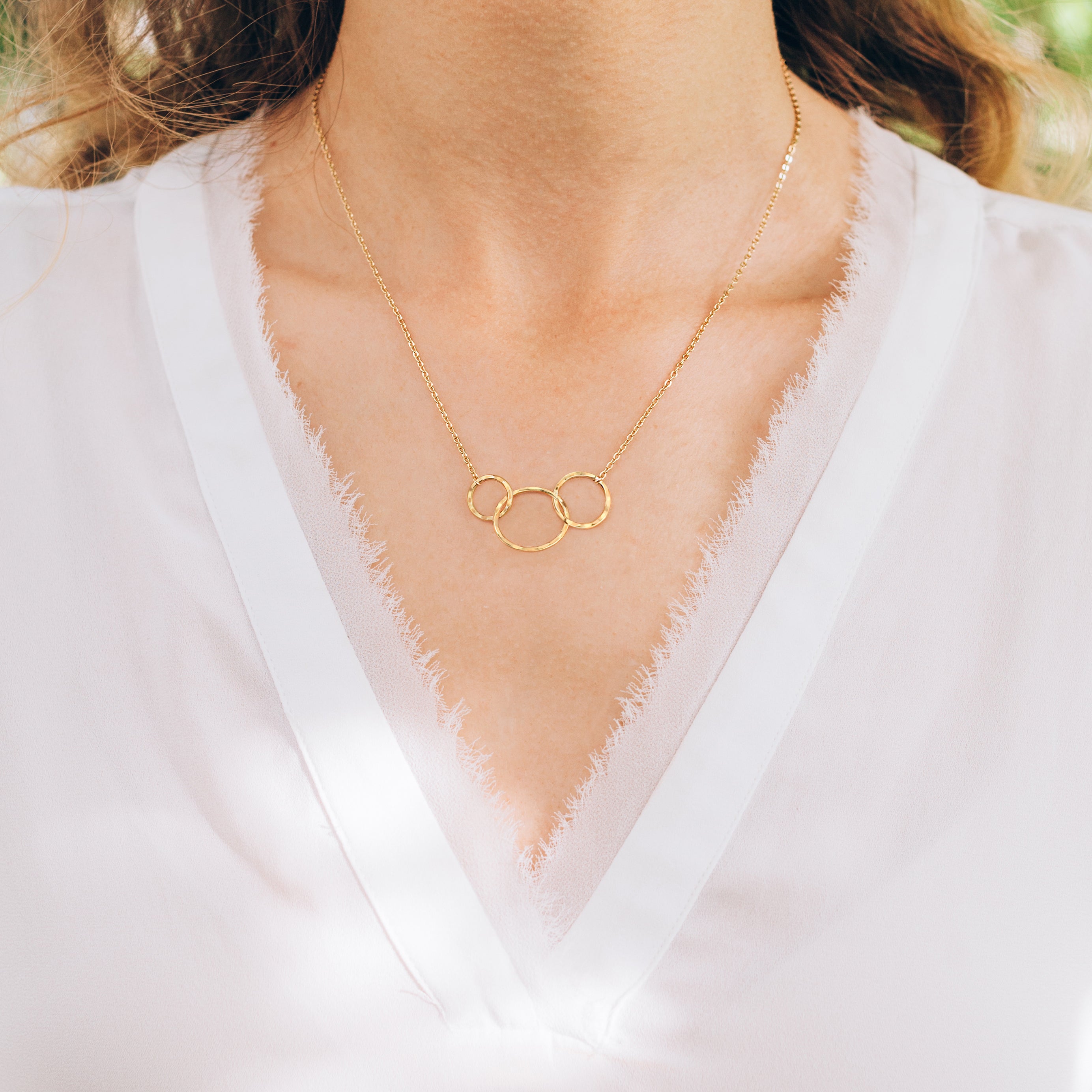 - Necklace is 18” long with adjustable ring at 16”. 3 ring pendant measures 1.2" in width and .65" in height. 2 ring pendants measures 1" in width and 0.65" in height.