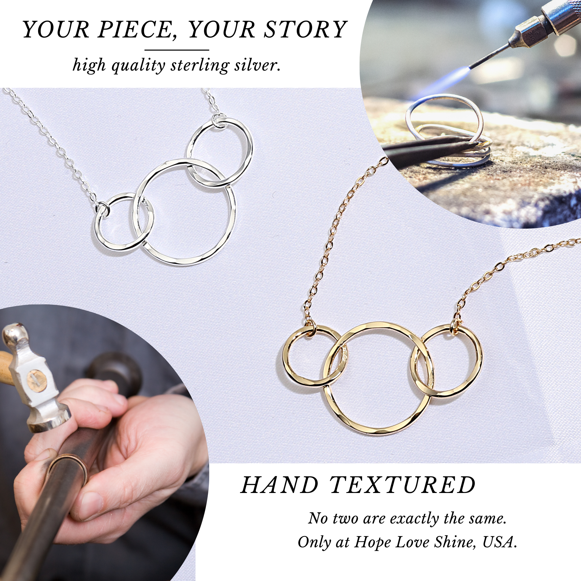 - Each pendant is textured by hand, creating a uniquely beautiful hammered finish that reflects light and sparkles with each movement. Every pendant has its own distinctive texture, no two are the same.
