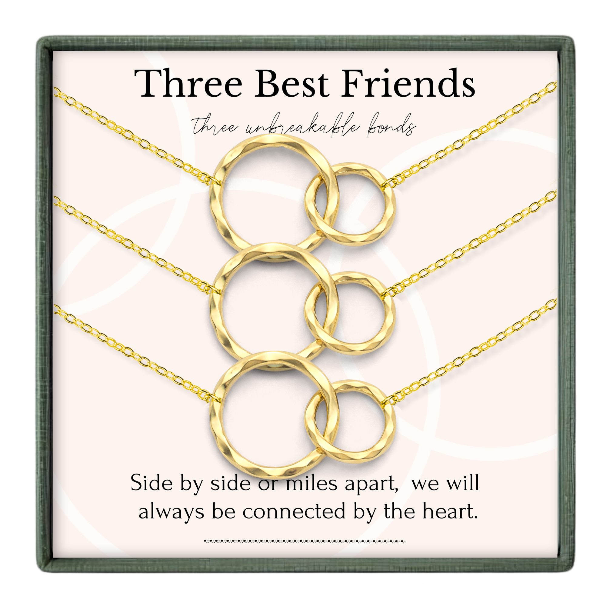 You may not be related by blood, but that doesn't make your bond any less special. Beautifully packaged, this gift is ready to give right away! Packaged as a set of 3 two ring necklaces - one for each friend.
