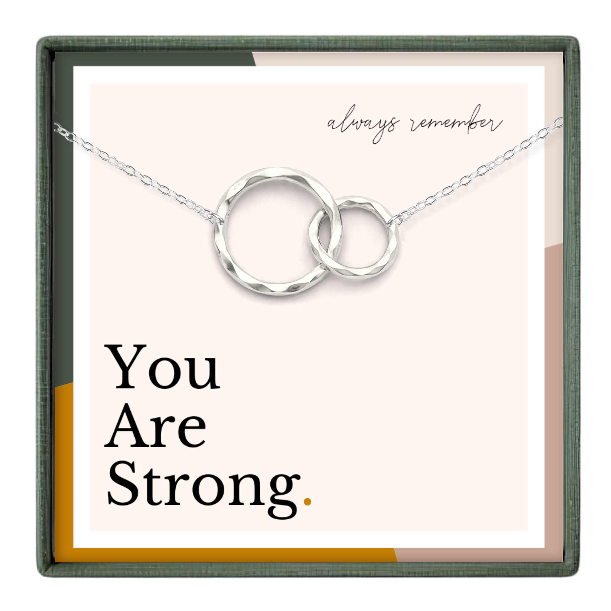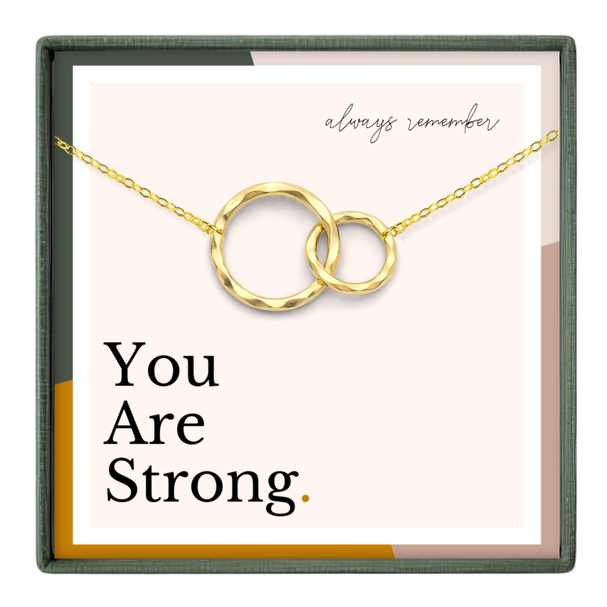 Our interlocking circles necklace symbolizes a fresh start and the strength to overcome obstacles. It serves as a constant reminder of strength, courage, and resilience. This necklace makes a perfect encouragement gift for women going through significant life changes.