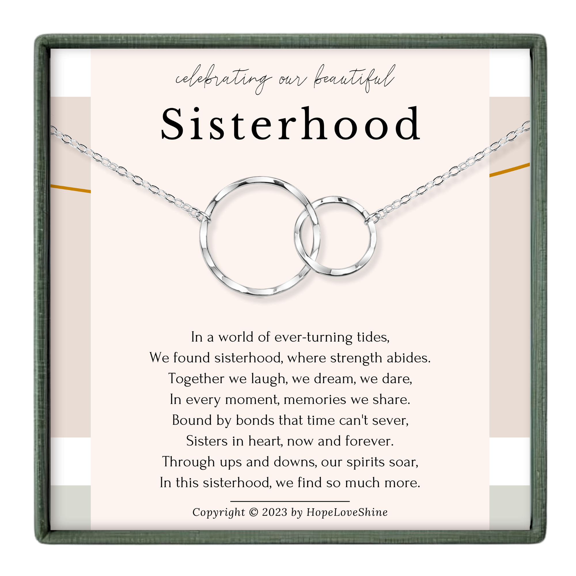 Celebrate the bond you share with a meaningful piece that honors sisterhood. This thoughtfully designed necklace serves as a beautiful reminder of the strength, loyalty, and love that define your connection. Perfect for expressing gratitude to a sister, best friend, or cherished companion, it's a wearable symbol of appreciation that she'll treasure. Whether marking a special milestone or simply saying "you matter," this necklace carries a message of support and solidarity. A gift that speaks to the heart and strengthens the ties that bind.
