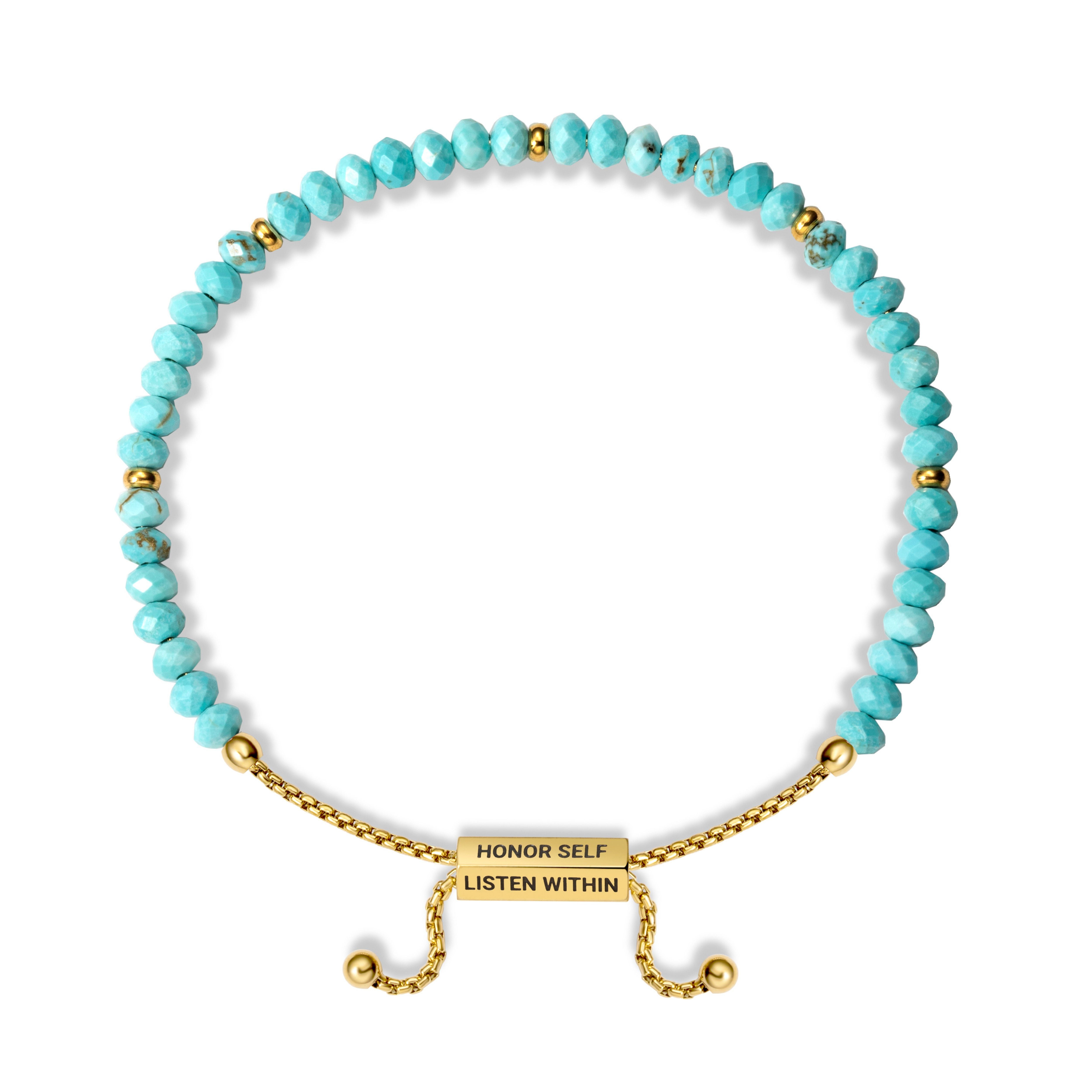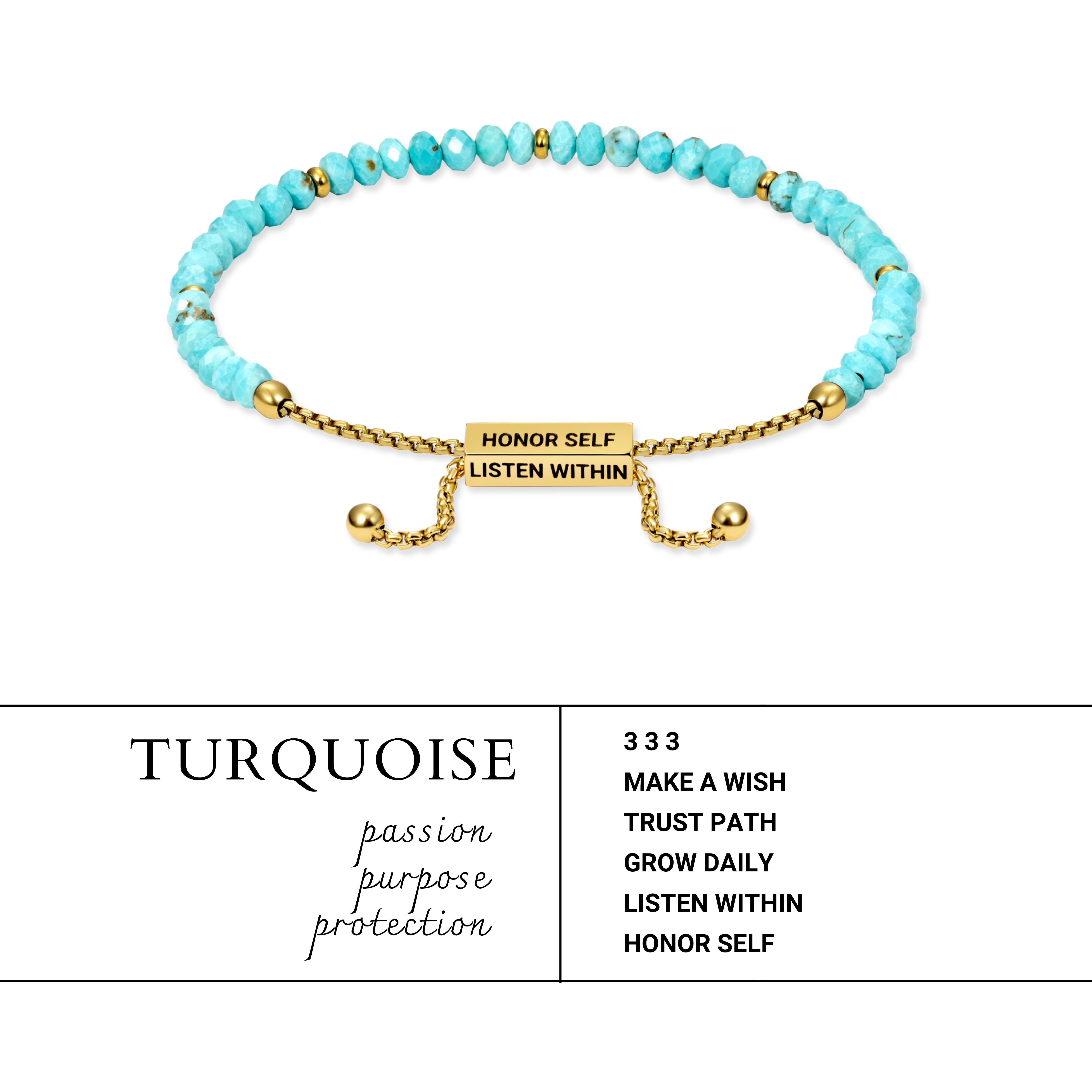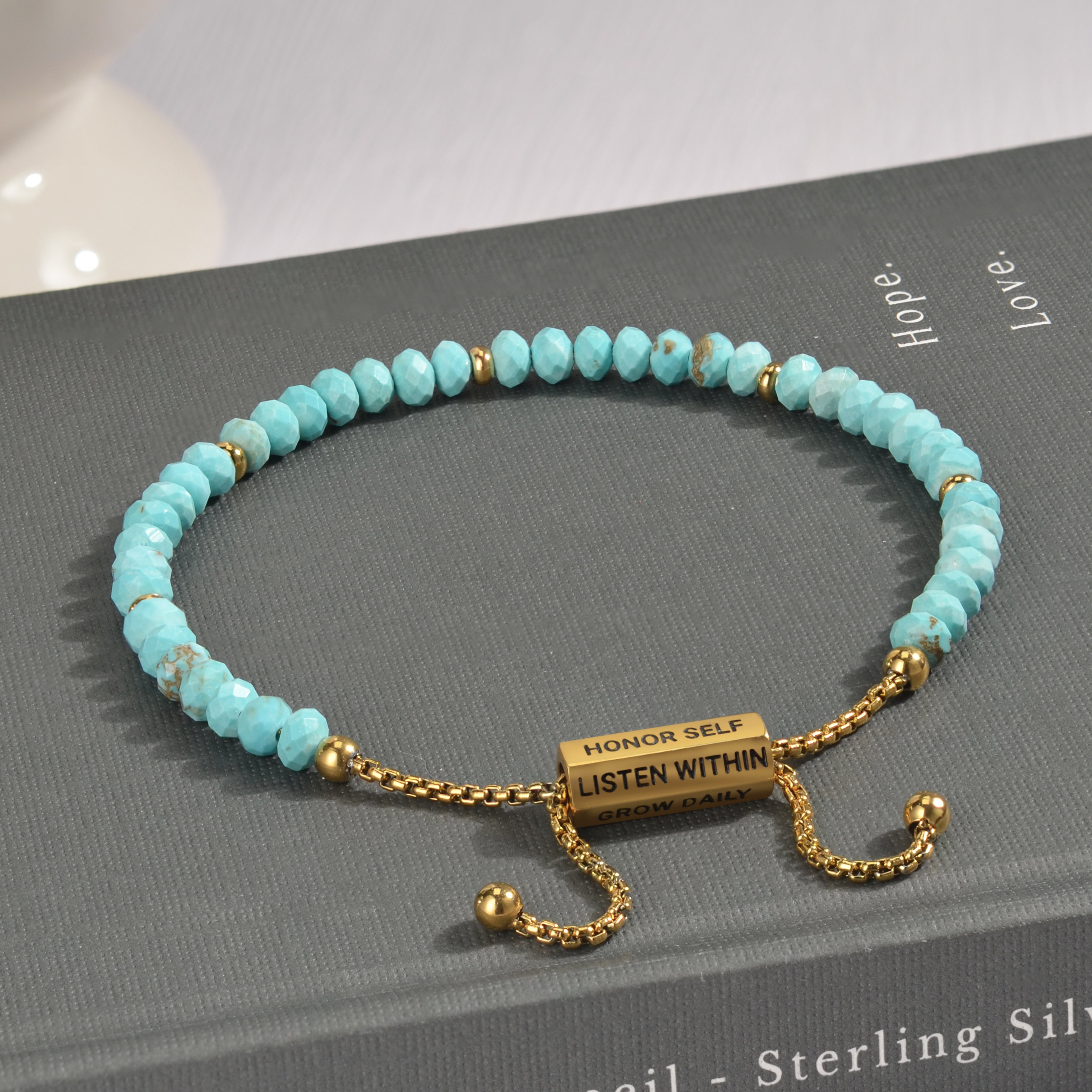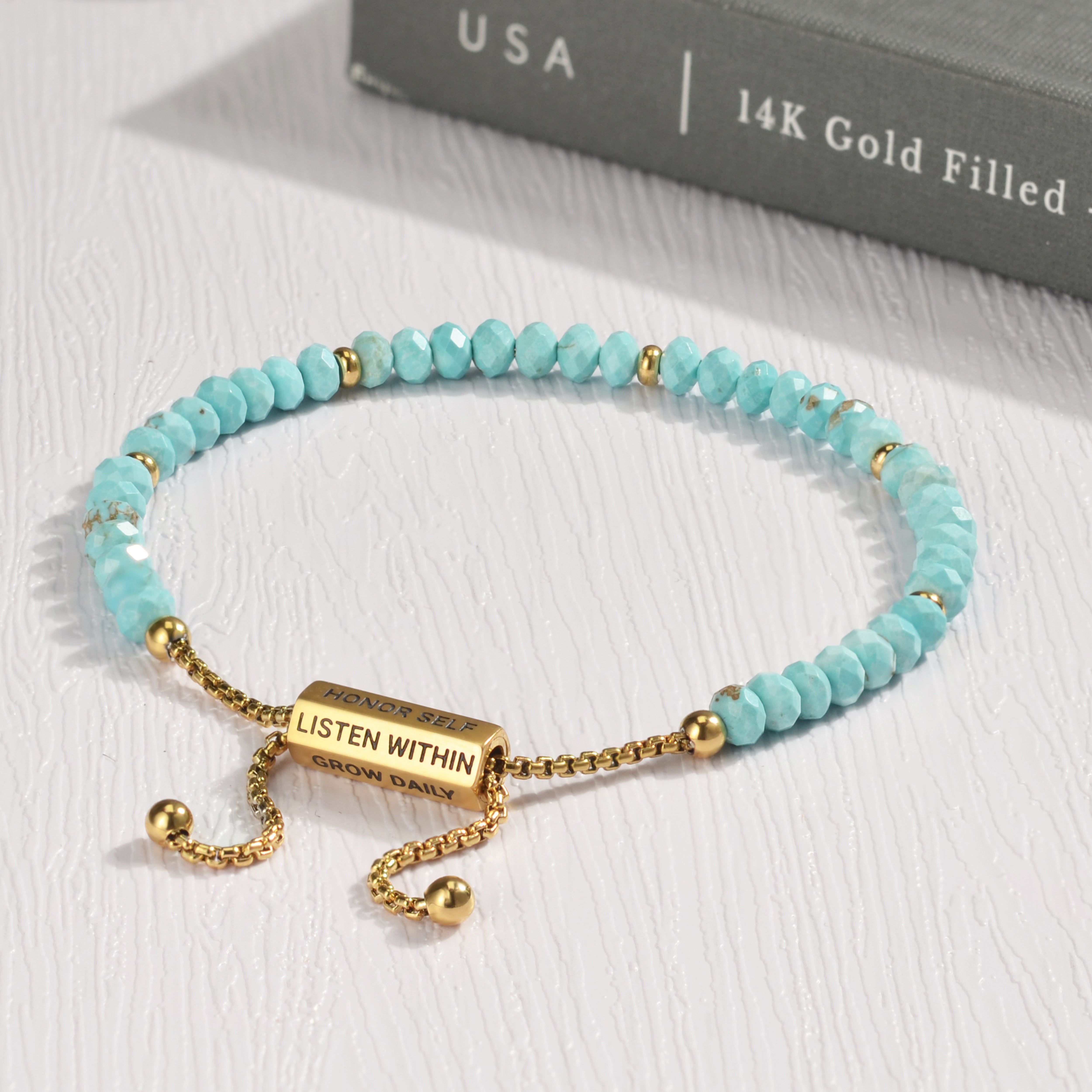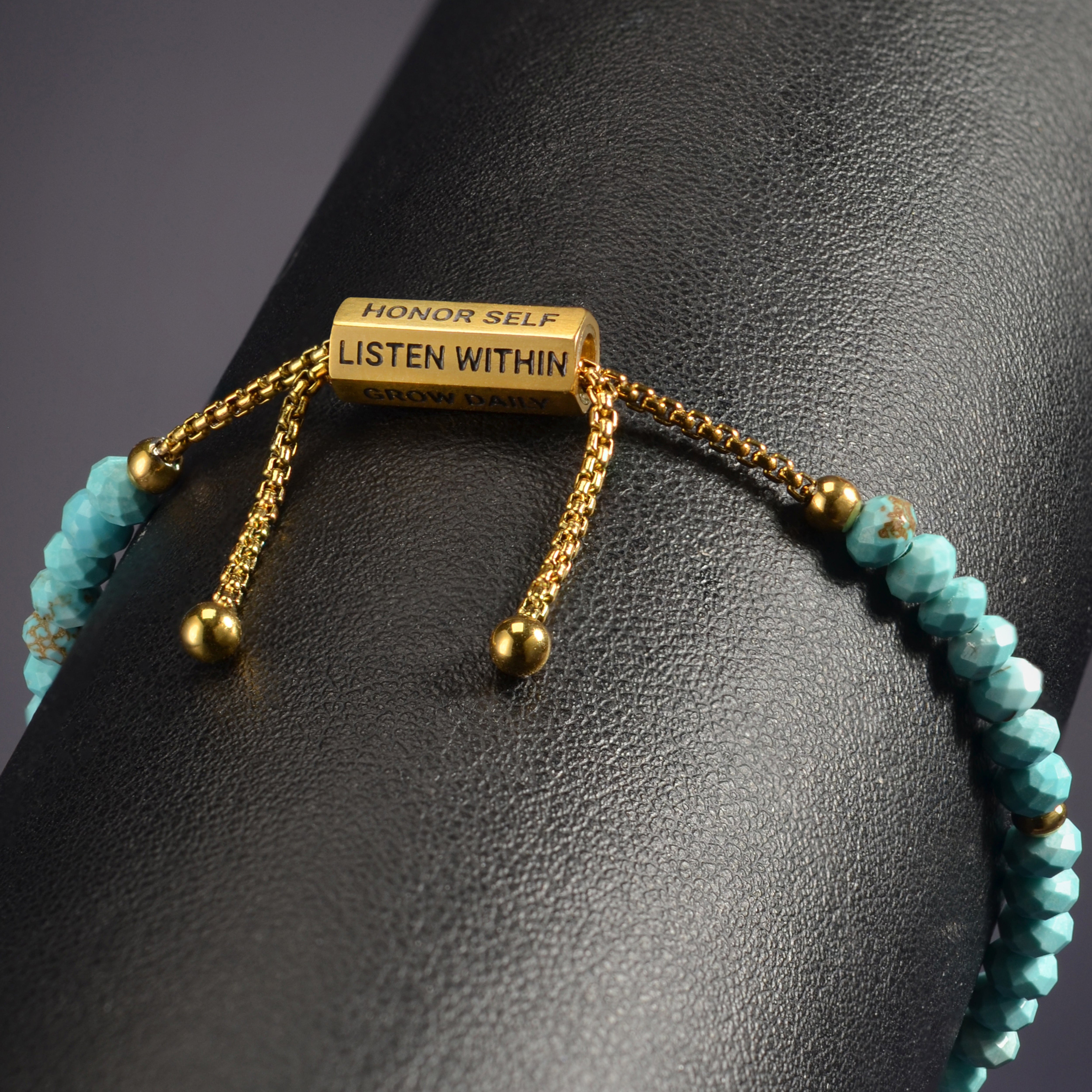 As a handmade piece, every bracelet is unique, just like you.  Turquoise is one of December’s birthstones, making it a perfect birthday gift. Each bracelet has a rotating bead engraved with motivational text.  The message you see when you look at your wrist is a reminder for yourself throughout the day:  MAKE A WISH, TRUST PATH, GROW DAILY, LISTEN WITHIN, HONOR SELF.