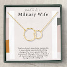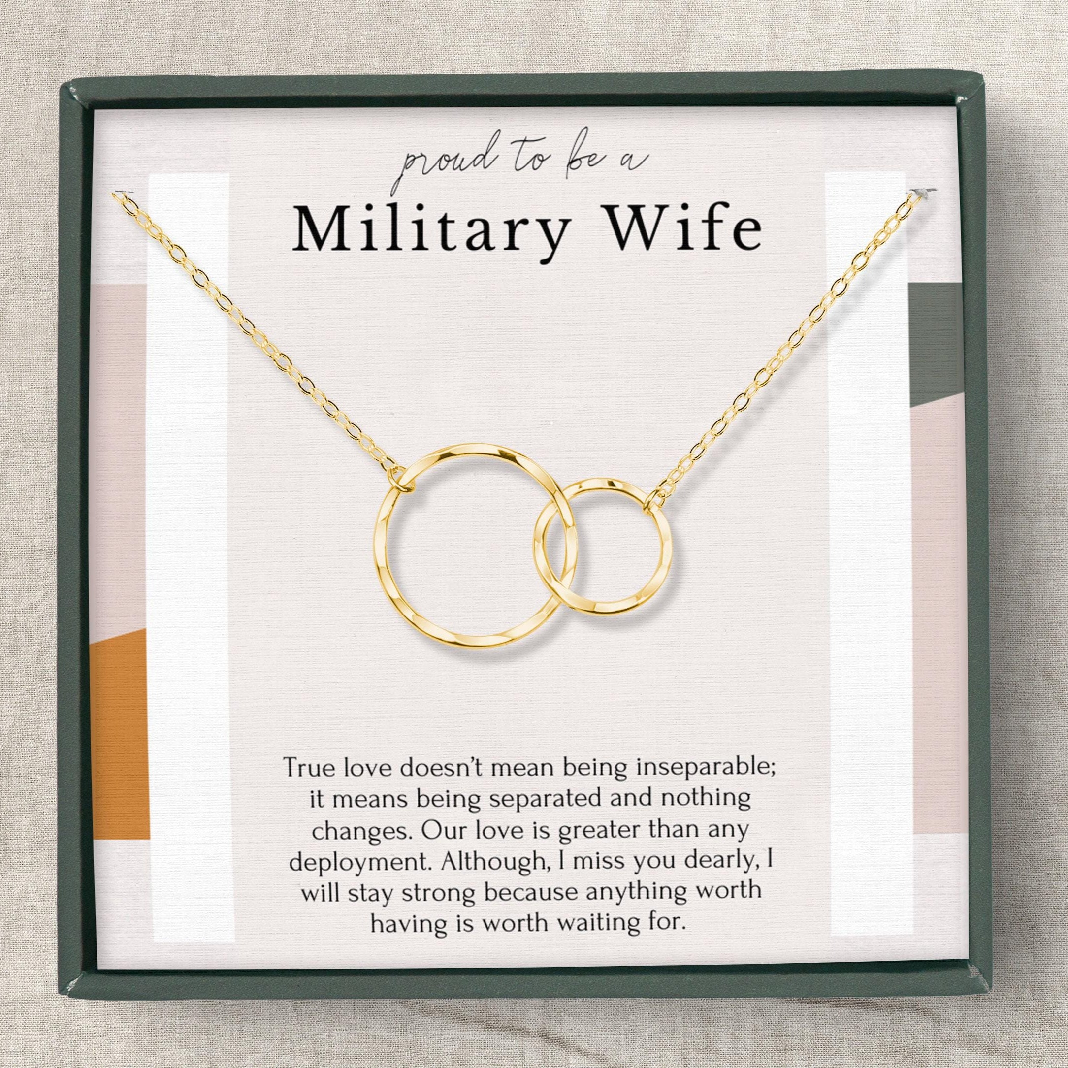 Military Wife Necklace, Deployment necklace, Deployment gift for wife, Military Wife Gift, Army wife necklace, Gold filled, Silver, Dainty Eternity necklace We hope this necklace will remind you how strong you are. Because your love is greater than any distance. and Anything worth having is worth waiting for. The unity link infinity circles represent an eternal bond between two hearts. A high-quality piece of jewelry that will be treasured for many years to come. ALL components are handmade with: 14K gold vermeil & sterling silver. A high quality piece of jewelry that she will treasure for many years to come. - Each pendant is textured by hand, creating a uniquely beautiful hammered finish that reflects light and sparkles with each movement. Every pendant has its own distinctive texture, no two are the same. - Necklace is 18” long with adjustable ring at 16”. - Pendant measures 1" in width and 0.65" in height. - Beautifully packaged in our custom designed jewelry box with a blank greeting card and jewelry care instructions. - If you would like to leave a gift message, select "This order is a gift" and then "Add gift message for free" at checkout. About 14K gold vermeil: Gold vermeil jewelry contains a thick layer of real gold. It is a durable, long-lasting precious metal with the prettiest light gold tone. To create gold vermeil jewelry, multiple layers of solid gold are pressure-bonded to a core of high-quality jeweler’s brass using extreme heat. Gold vermeil metals are at least 15 times more expensive than plated gold materials. Unlike gold plated metals, gold vermeil metal price depends on the market value of gold at the time of purchase. Will gold vermeil ever tarnish? Gold vermeil can tarnish naturally over time, but it’s easily cleaned. If using a polishing cloth, it should be used LIGHTLY and not pressed hard against the metal to remove tarnish, as it could rub off the gold on your piece over time.