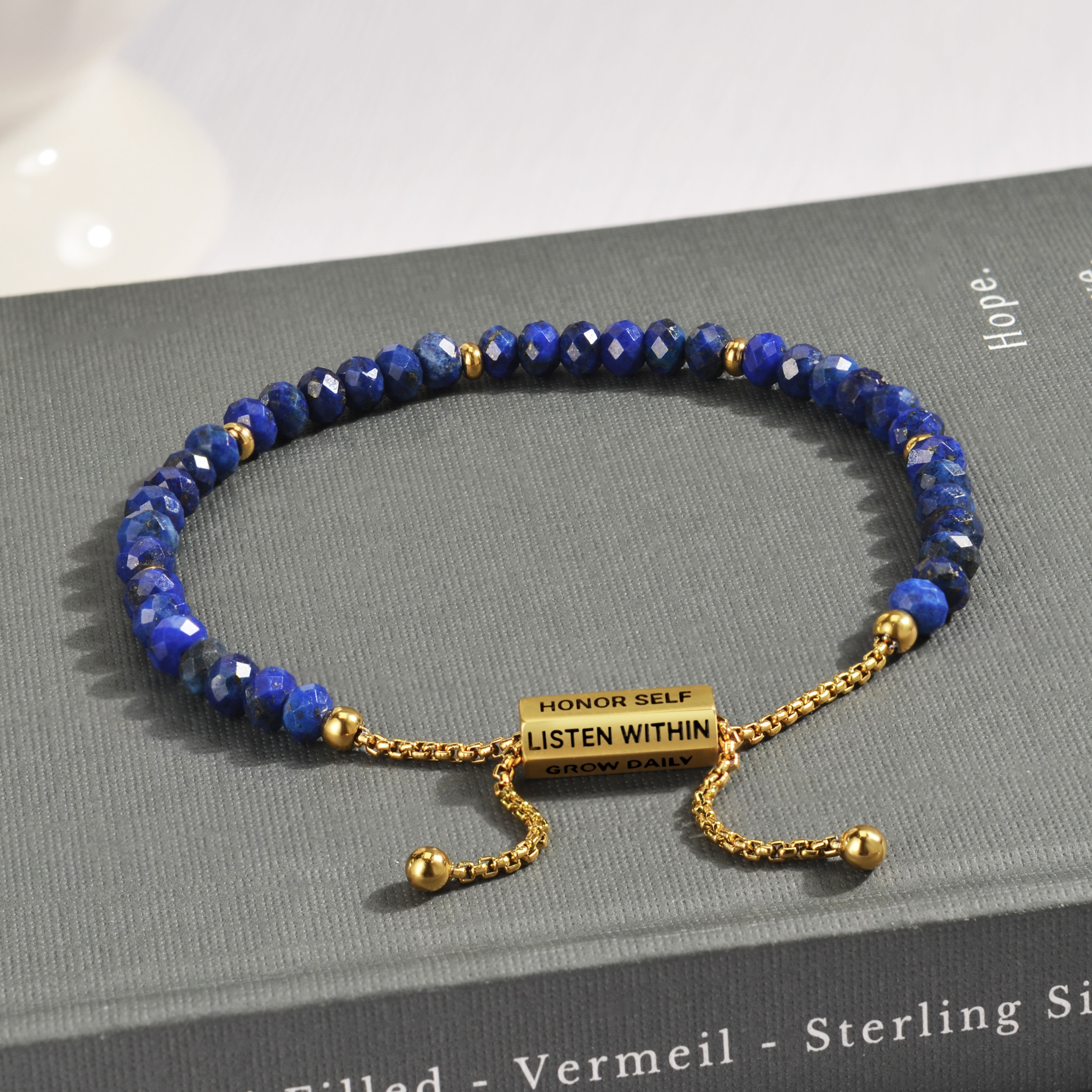 As a handmade piece, every bracelet is unique, just like you.  Each bracelet has a rotating bead engraved with motivational text.  The message you see when you look at your wrist is a reminder for yourself throughout the day:  TRUST PATH, CLEAR MIND, GROW DAILY, LISTEN WITHIN, HONOR SELF.