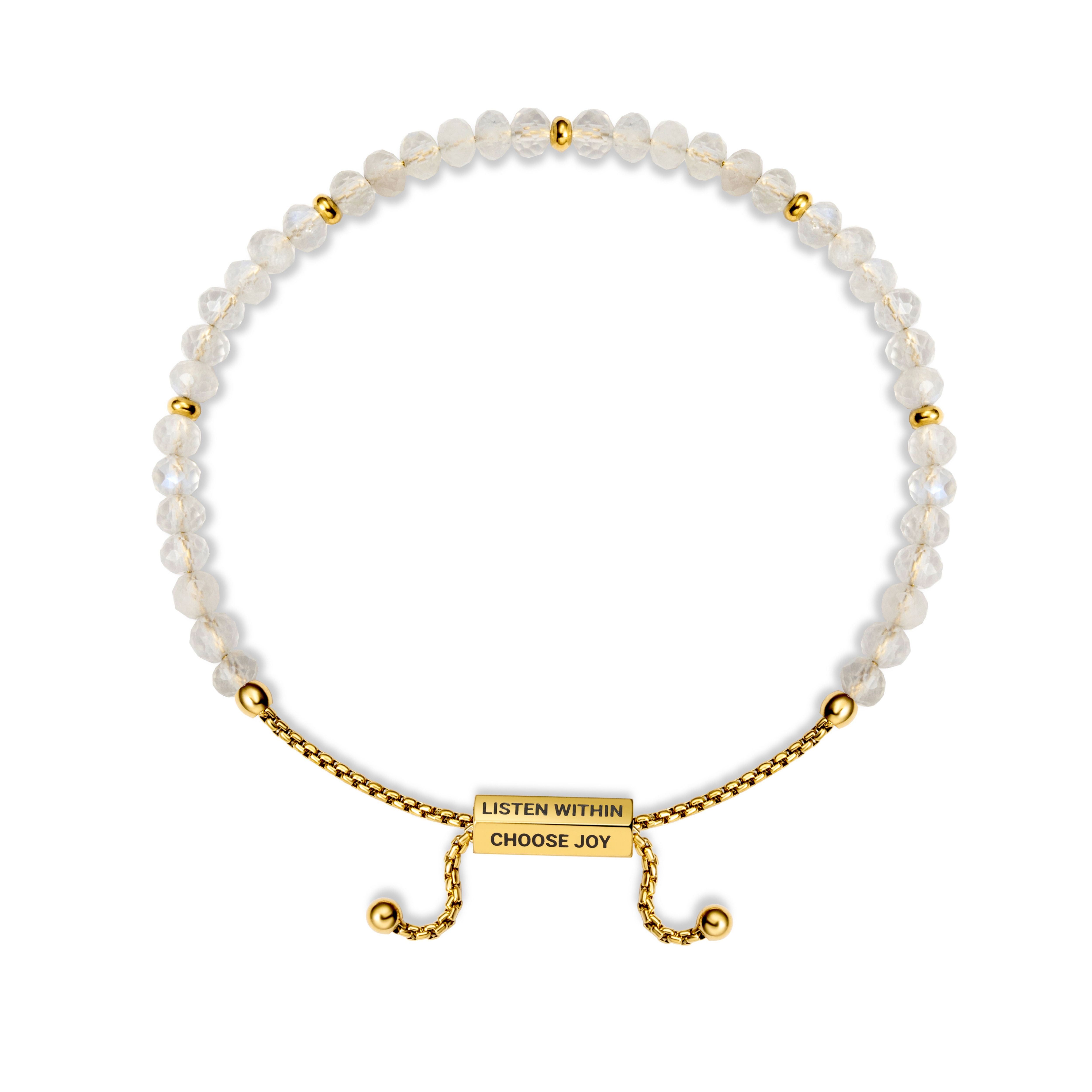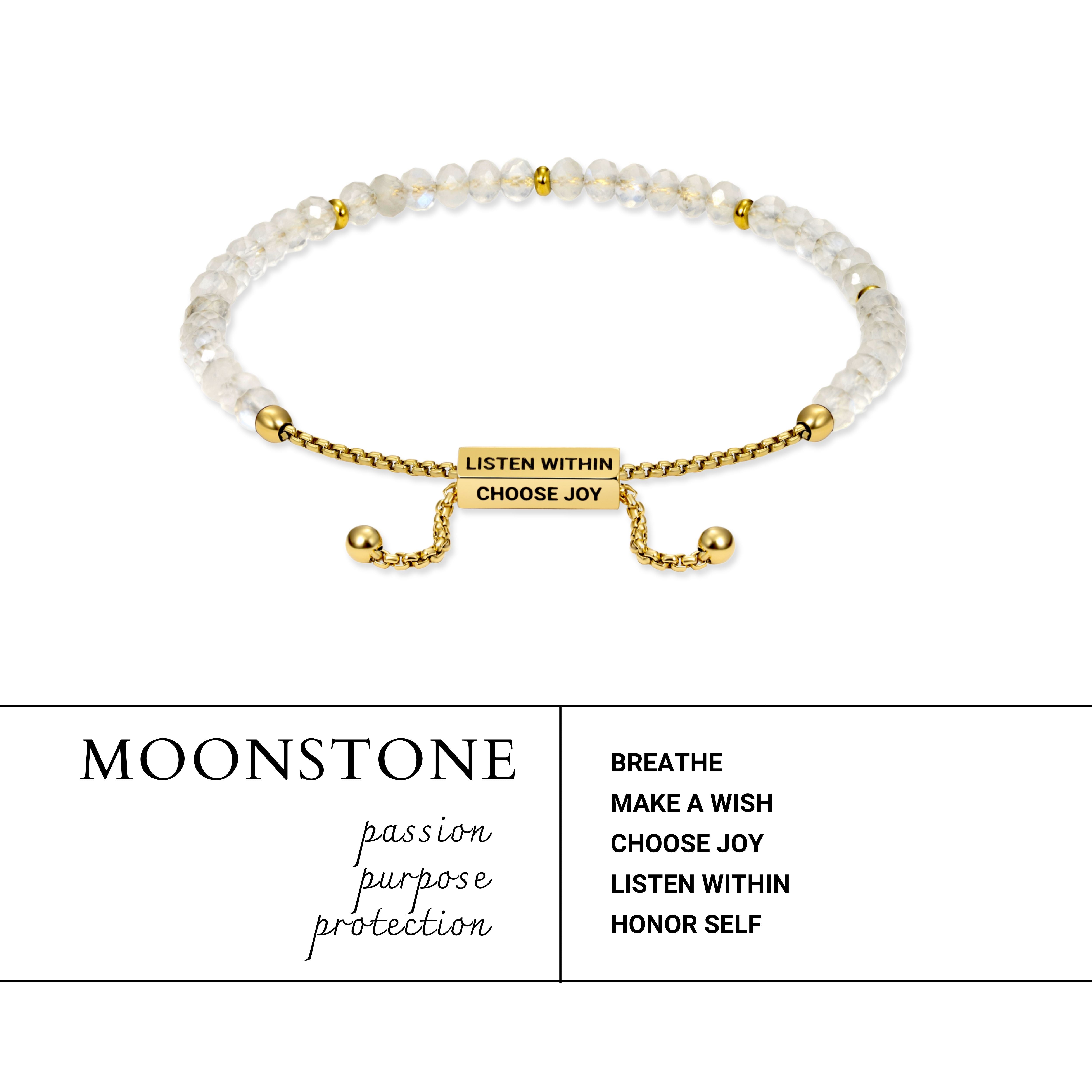 As a handmade piece, every bracelet is unique, just like you. Moonstone is one of the birthstones for June, making it a perfect birthday gift. Each bracelet has a rotating bead engraved with motivational text. The message you see when you look at your wrist is a reminder for yourself throughout the day: BREATHE, MAKE A WISH, CHOOSE JOY, LISTEN WITHIN, HONOR SELF.
