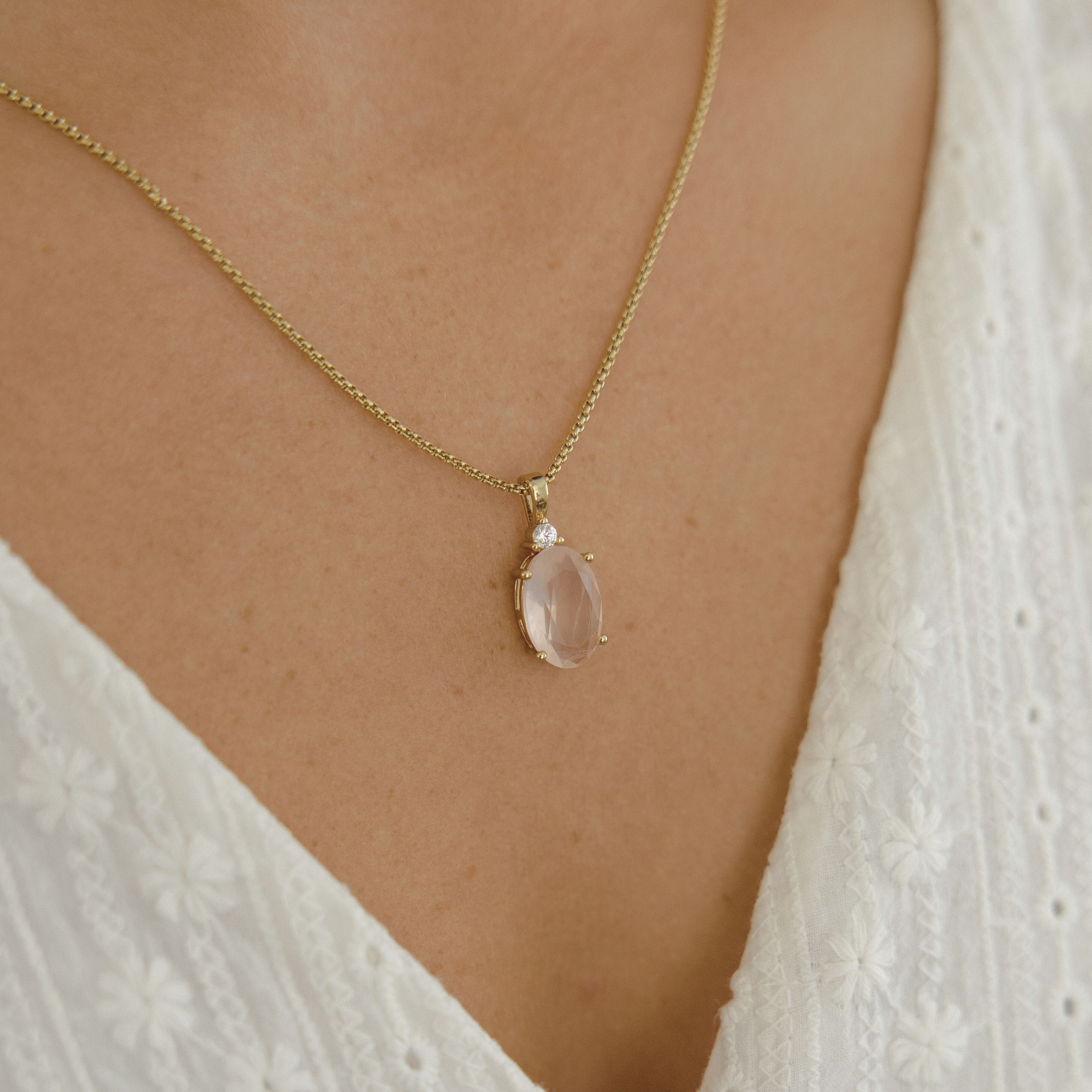 The pendant features a natural rose quartz crystal — the stone of unconditional love and emotional connection. It hangs from an 18" box chain, crafted from 18K gold over stainless steel. Durable, elegant, and made for everyday wear.