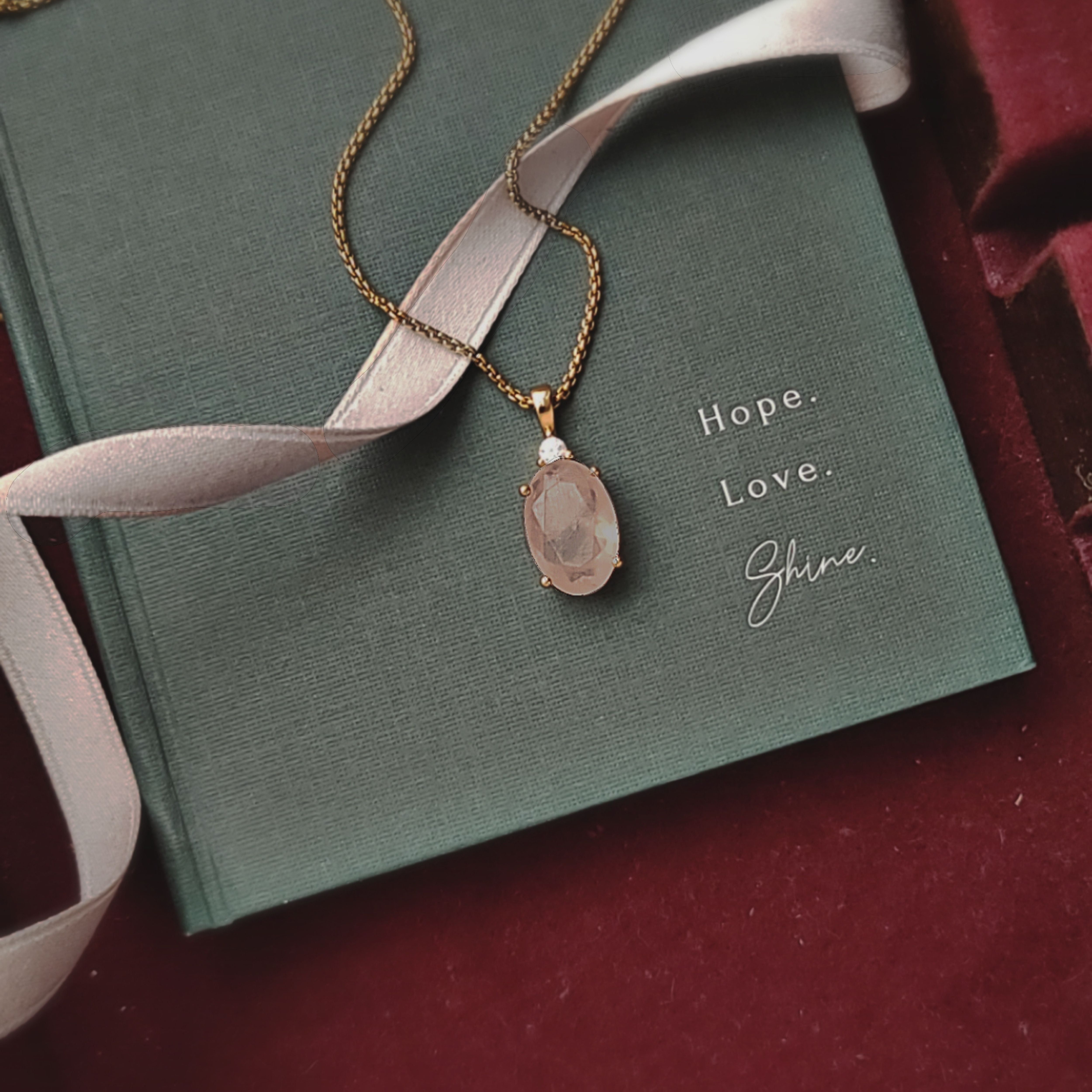 -Genuine rose quartz pendant (0.38" W x 0.95" H) — symbol of love, trust, and emotional balance