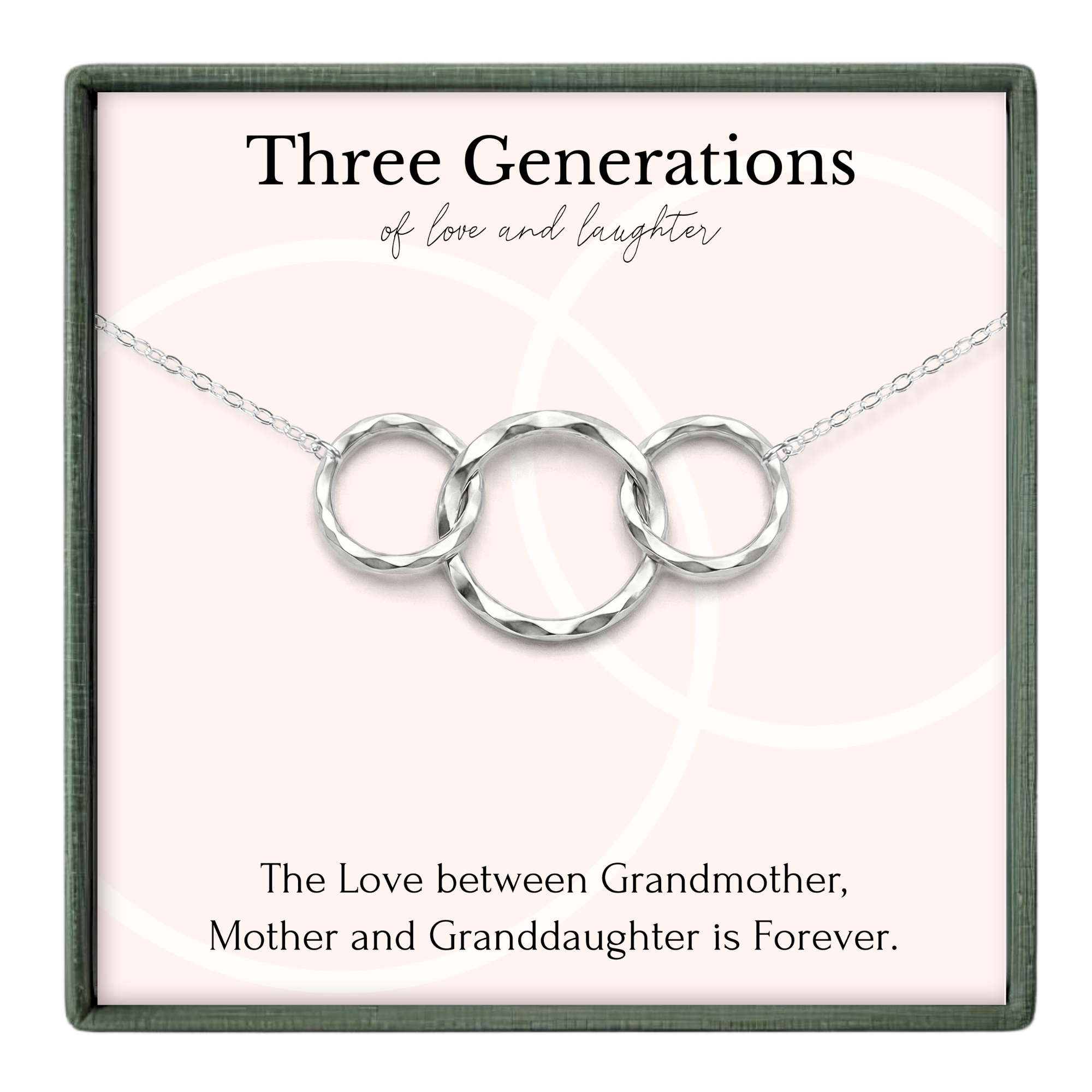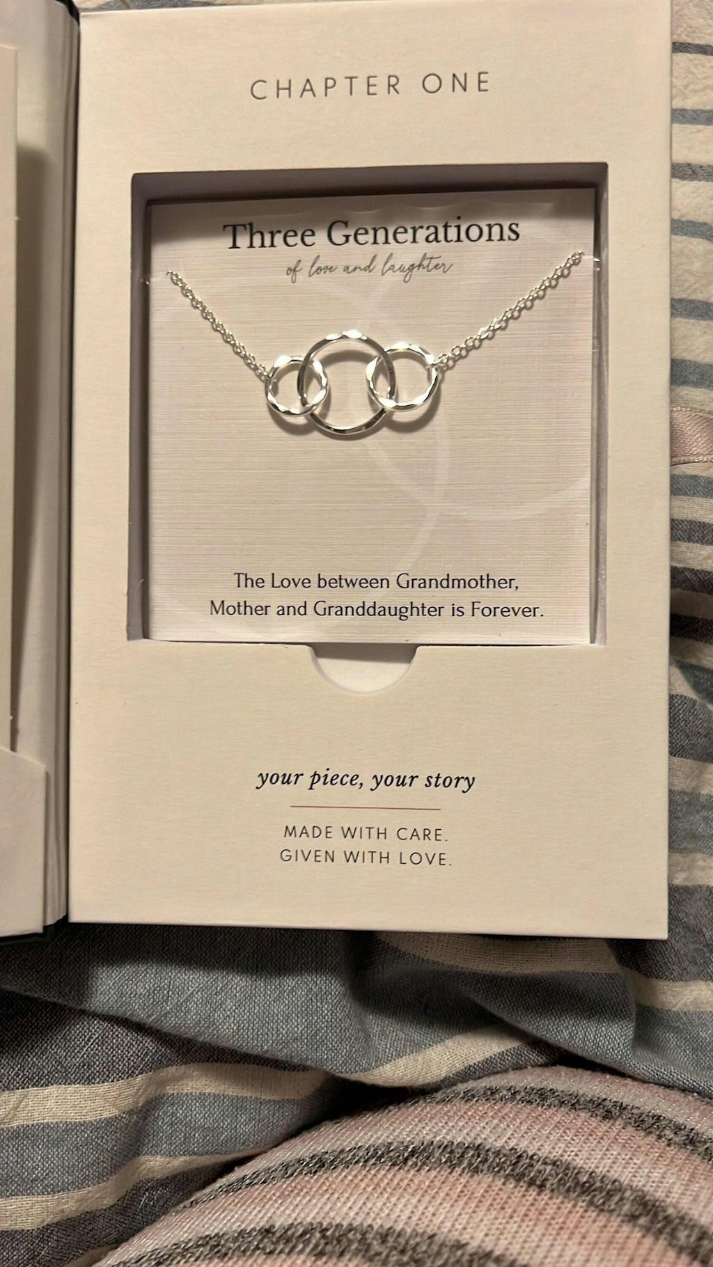 The love between you, your mother and grandmother is one that spans generations. Symbolize this special bond with a stunning three ring necklace.  Beautifully packaged with a meaningful message, this is a gift that will stay close to your heart.