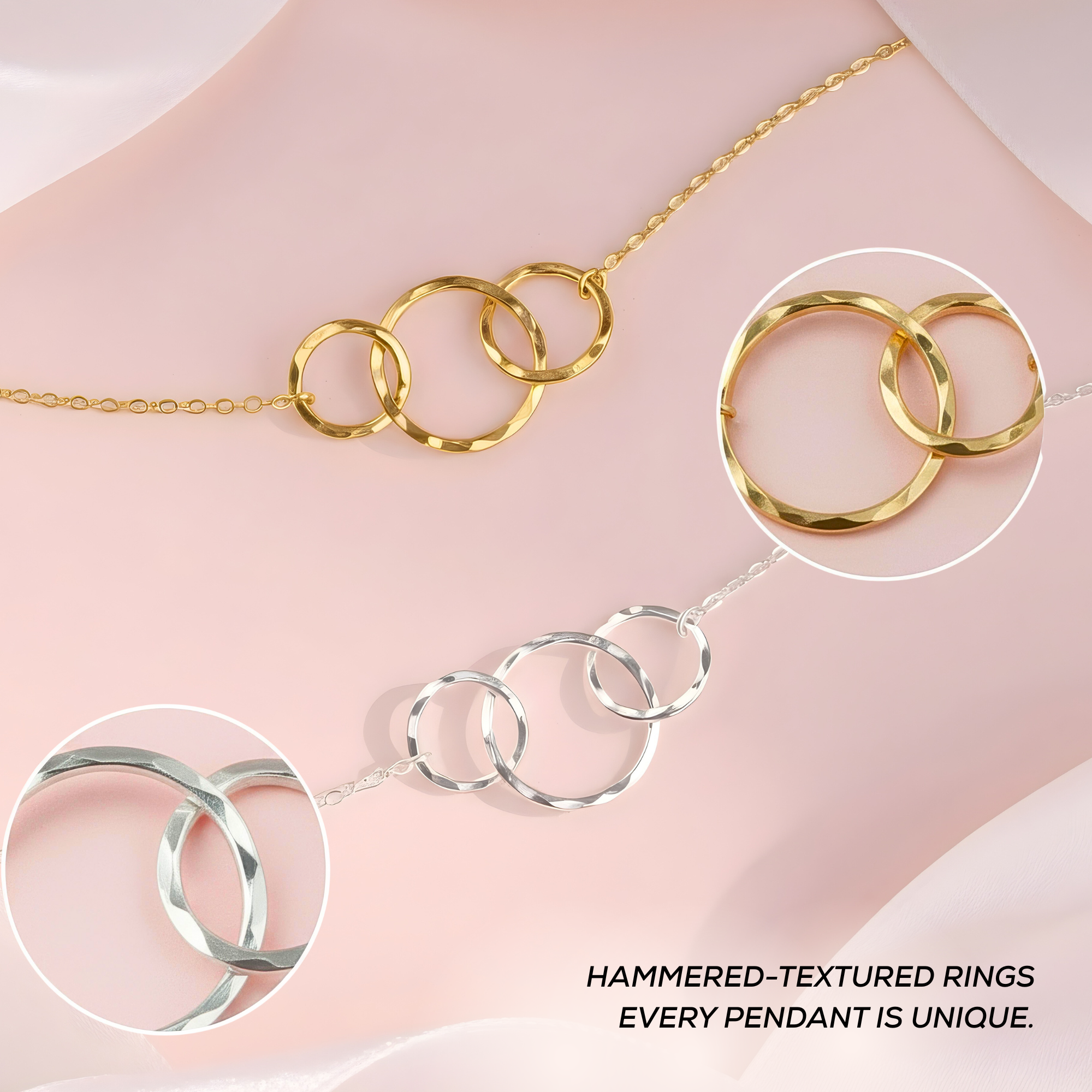 - Each pendant is textured by hand, creating a uniquely beautiful hammered finish that reflects light and sparkles with each movement. Every pendant has its own distinctive texture, no two are the same.